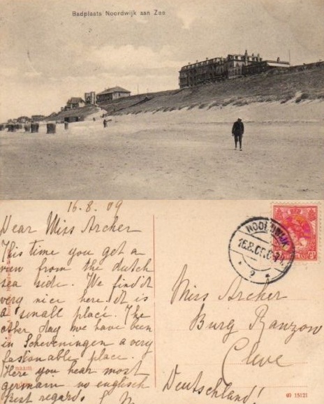 Op 16 augustus 1909 ging deze kaart naar ene mevrouw Archer die woonde op Burg Ranzow in Kleef, net over de grens. Het is niet een erg uitnodigend verhaal: aan de fotozijde een verlaten iemand op een doods strand. Verder was Noordwijk een klein plaatsje, waar het wel prettig verblijven was, maar Scheveningen was eigenlijk veel interessanter. Tsja.