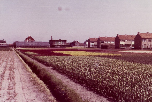 Het bloembollenveld ligt achter de opstallen van de firma Konynenburg & Mark, in de verte aan de Nieuwe Zeeweg nog te ontwaren. Er was een tijd dat dit veldje regelmatig besproeid werd, eerst door een klein vliegtuigje, later door een kleine, wendbare helikopter. Iedere keer als we geraas hoorden, renden we naar buiten om ademloos toe te kijken bij het behendige sproeiwerk van vliegtuig of heli die laag boven het veldje vloog.