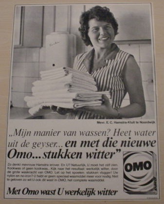 Mevrouw E.C. Hamstra-Kluit uit Noordwijk wist het wel: beetje OMA in een emmertje heet water uit de geiser en voilà: een kind kan de was doen. Het is interessant om te zien dat door de jaren heen de reclames voor wasmiddelen nauwelijks veranderd zijn: een gedegen huisvrouw die staat te kirren bij haar witte was, vaak in een nagesynchroniseerde vorm, want die reclame moet in meer landen zichtbaar zijn in even zovele talen. Omdat alles hetzelfde is kun je uiteindelijk merken als Sunil en OMO en Dash en zo nauwelijks meer van elkaar onderscheiden. Behalve mevrouw E.C. Hamstra-Kluit uit Noordwijk natuurlijk, maar die werd er dan ook voor betaald.