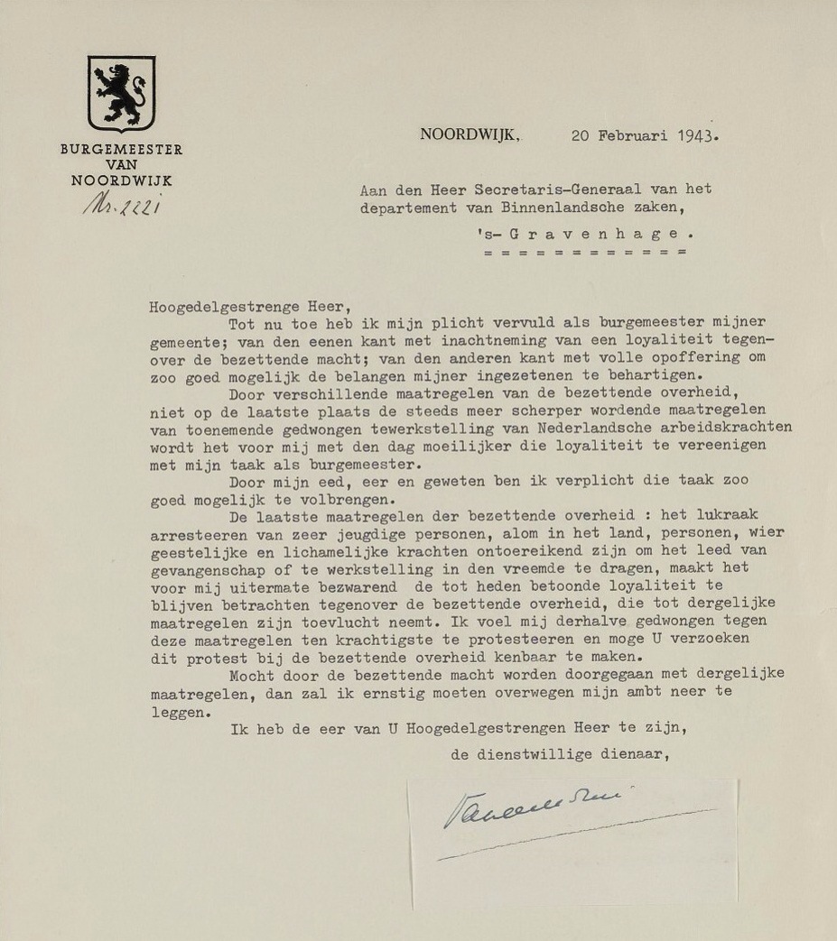 Een brief van burgemeester Dr. J.B.V.M.J. van de Mortel aan de dienstdoende superieur in Den Haag middenin de oorlog. Van de Mortel laat weten dat hij het bijna zat is en eigenlijk al niet meer in staat is om zijn ambt op een integere wijze te vervullen met de Duitse machten boven hem. “Burgemeester in oorlogstijd” is na 1945 een wat beladen term geworden. Er werden bestuurderen mee aangeduid, die na de inval van de Duitsers op hun post waren blijven zitten en soms ook gedwongen waren mee te werken aan maatregelen waar men tegen was. Maar onder het motto ‘om erger te voorkomen’ wisten ze toch ook vaak nog hele goede dingen voor hun burgers te bereiken. Maar er waren grenzen natuurlijk en de beladenheid van de term is ontstaan bij de beoordeling van sommigen, die bepaalde veronderstelde grenzen overschreden. Van de Mortel niet: zijn brief getuigt van grote moed. Hij schreef de brief op 20 februari 1943. Hij zou het nog een tijdje aanzien, maar op 20 januari 1944 was het toch zo ver en trad hij af. Hij werd vervangen door de NSB-er Musegaas, maar na de oorlog zou Van de Mortel weer een jaartje terugkomen in zijn oude ambt. Hij had het goed gedaan en wilde het ook goed afmaken.
