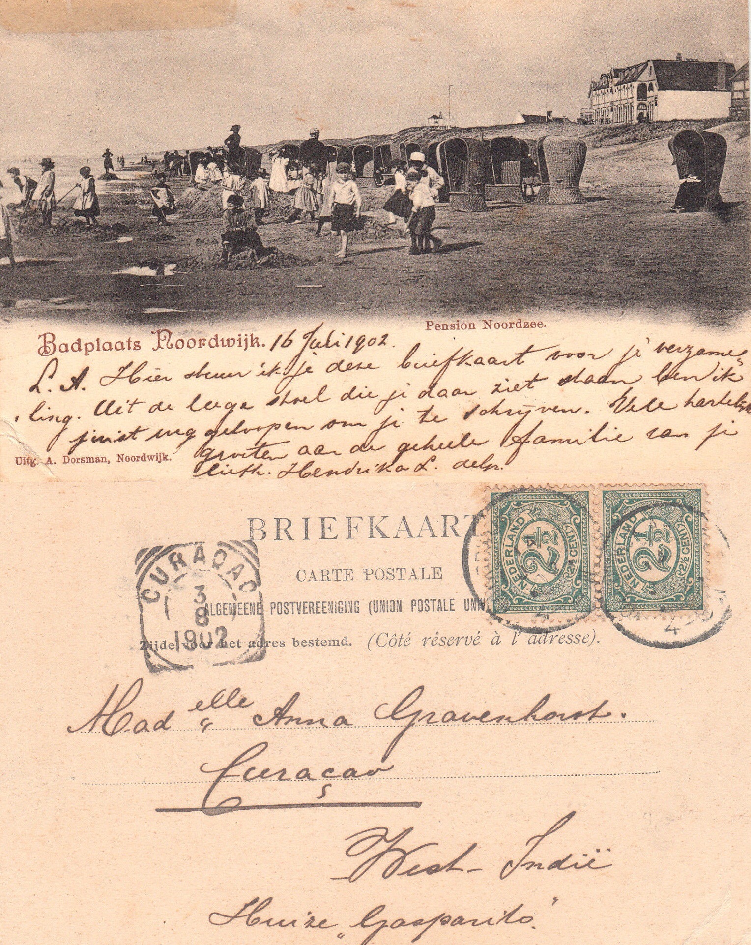 De kaart ging op 12 juli 1902 naar Curaçao “West-Indië” en de afzendster maakte nog een grapje over de strandstoel waaruit zij was opgestaan om de kaart te schrijven. Aan ene “Anna Gravenhorst”, over wie ik twee wetenswaardigheden bij elkaar heb kunnen googelen (helaas geen foto):