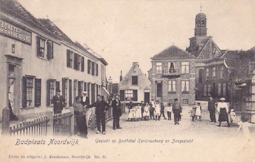 Je zou deze en nog een heleboel soortgelijke kaarten op één hoop moeten gooien en je zou een hele berg krijgen. Mensen, poserend op het Calisplein naast het pension van de oude Van Konynenburg (“Knyn” in de Noordwijkse volksmond). Ik heb er al veel laten zien in deze bloggenreeks. Maar deze kende ik geloof ik nog niet. Vooral die keurig in het gelid staande kids op de achtergrond en dat prachtig geschilderde naambord “Badhotel Konynenburg” springen er op deze foto het meeste uit. Dat bord had iemand moeten bemachtigen en na moeten laten aan Museum Oud-Noordwijk., maar helaas.