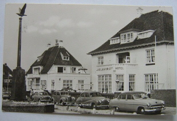 De inmiddels verdwenen Villa helmhorst van de Noordwijkse architect en aannemer Leonhard Lang was tot twee maal toe het decor van een Nederlandse speelfilm: “De Vierde Man” en “Broos” werden beiden hier opgenomen. Maar daar gaat het nu niet over. Wat me vooral treft in dit beeld is dat rijtje prachtige automobielen, dat hier voor de deur geparkeerd staat: ik zie links een Fiat (1500?), daarna iets onbekends (Opeltje?) en dan een Austin en een Opel (Olympia?). En dat alles onder het monument voor Rudolf Tappenbeck van de Noordwijkse beeldhouwer Oswald Wenckenbach.