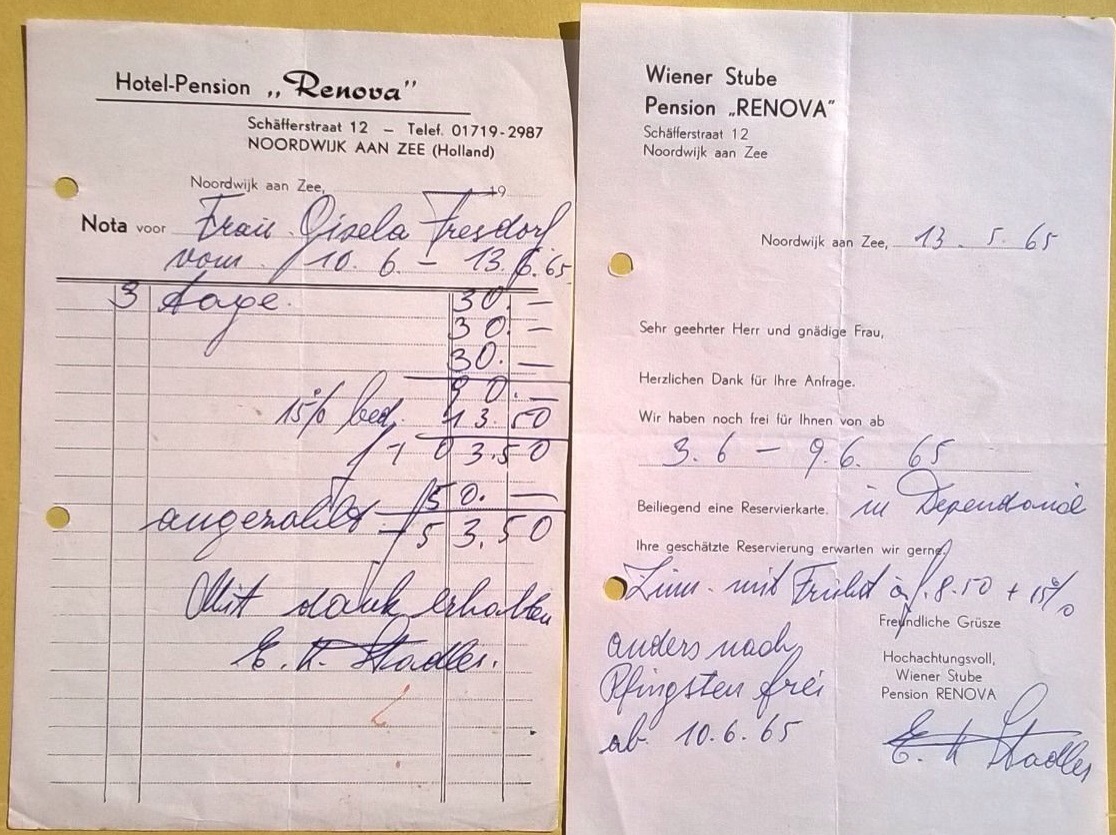 Een rekening en een reservering, ondertekend door Elise K. Stadler, eigenaresse en uitbaatster van Wiener Stube Renova aan de Schäfferstraat in Noordwijk aan Zee. Voor ene Frau Gisela Fresdorf. Maand juni 1965. Zimmer mit Frühstück kostte toen voor één nacht achteneenhalve gulden (exclusief 15%). Fresdorf kwam blijkbaar ‘nach Pfingsten’, want toen was er nog ruimte vrij.