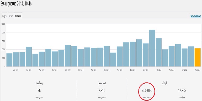 BLOGnoordwijk startte ooit voorzichtig in november 2005 op een daartoe door De Volkskrant gecreëerde ruimte. Maar het Volkskrant-initiatief ging aan zijn eigen succes ten onder in het voorjaar van 2011. Vanaf mei 2011 moesten vele bloggers uitwijken naar elders. Ik kwam bij wordpress.com terecht met BLOGnoordwijk en vanaf mei 2011 kreeg dit blog meer dan 400.000 hits. De ‘magische grens’ werd vandaag doorbroken.
