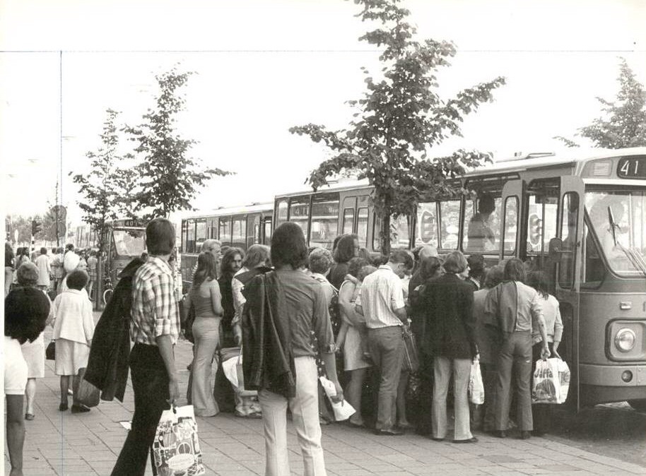 De bussen 41 en 40 staan op het Stationsplein in Leiden op het punt te vertrekken naar respectievelijk Katwijk en Noordwijk. In Leiden hadden ze vroeger altijd de vraag: “Het is geel en het gaat terug in de tijd. Rara (met zo’n rollende Leidse r) wat is dat?” Ik antwoordde altijd: “De bus naar Katwijk!”