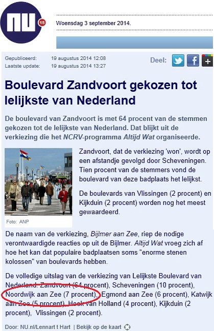 Maar hopelijk is zo’n enquête een signaal aan de betreffende gemeenten om er iets aan te doen. Wat Noordwijk betreft weet ik het wel (en ik herhaal het nog maar eens een keer): een boardwalk van vuurtoren tot Tappenbeck-monument, langs de hele Noord en de hele Zuid en niks te maken met Huis ter Duin!.