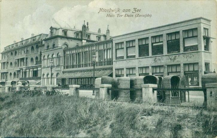 Een foto van Huis ter Duin uit 1910. Ter linkerzijde van het oorspronkelijke gebouw is de nieuwe vleugel al in strak gepleisterd baksteen gegoten. Rechts van de houten laagouw heeft de eerste uitdijing naar het zuiden al plaatsgevonden, maar die zou daar niet ophouden. Huis ter Duin is altijd al geweest als een uitdijend heelal, krachtiger dan de ruimte erom heen.