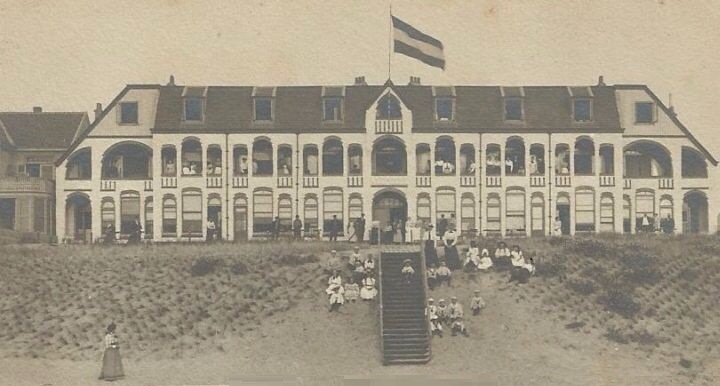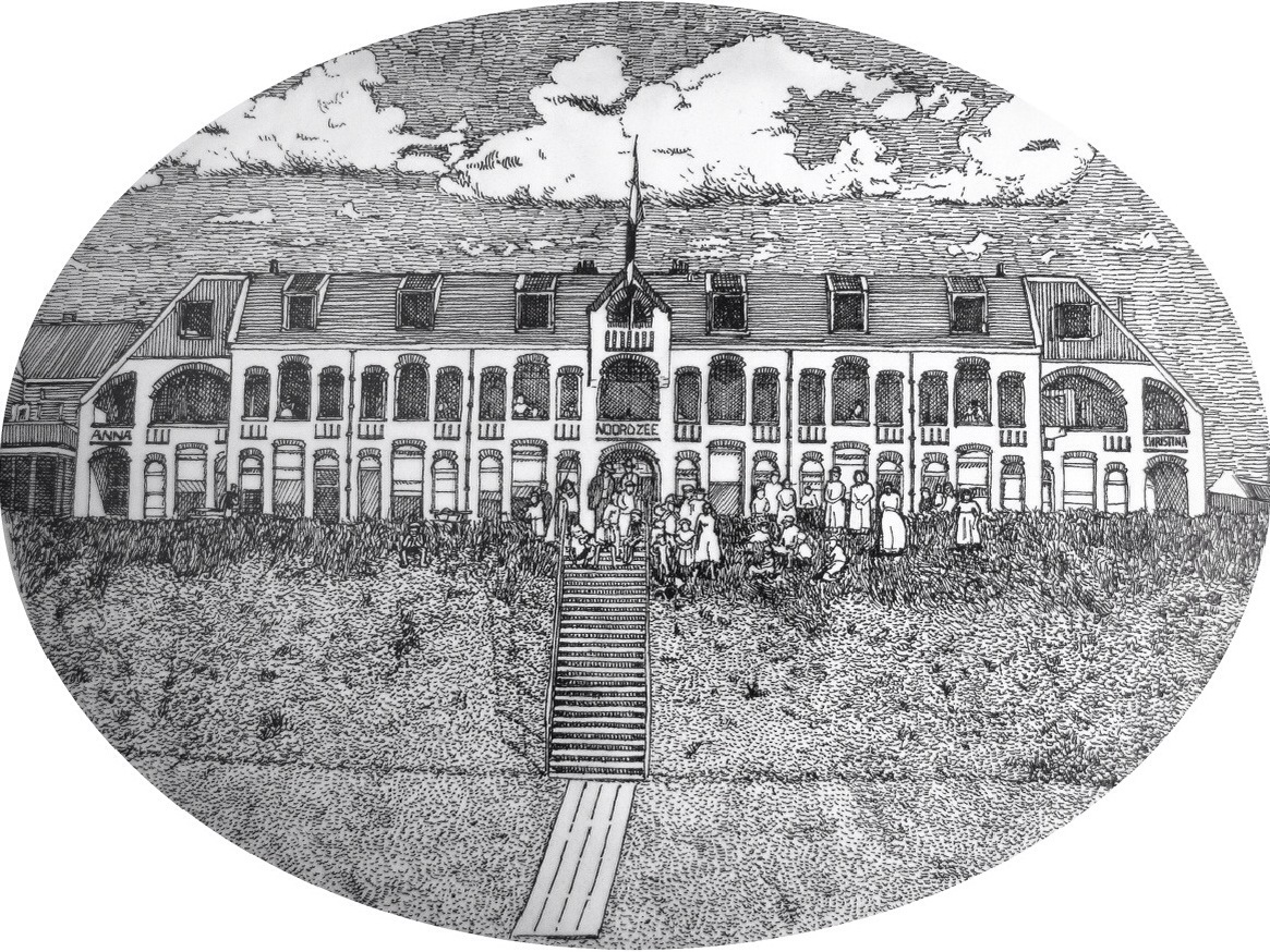 Een prachtige tekening van Kenneth B. van Hotel Pension Noordzee ergens tussen 1898 en 1901 (de bouw begon in 1898 en het aanpalende ‘torentje’ staat er nog niet bij). Verstilde schoonheid van architect Henk Jesse en genoemde kunstenaar Kenneth B. Gemaakt midden Jaren Zeventig, de tekening heeft nog jaren in het inmiddels danig veranderde ‘Noordzee’ gehangen. Hieronder de hand van de meester bezig met het geheel en het eindresultaat met opdruk.