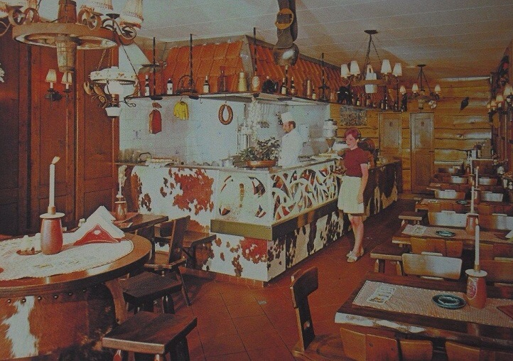 Intussen stel ik vast dat ik bij Michel nog geen hap door mijn keel had kunnen krijgen. Alles aan dit restaurant – hoe “petit” ook – is fout : de karrewielen aan het plafond met die scheve lampenkappen van varkensblaas, het veuls te grote pannendak boven de bar, de met koeienhuid beklede tafel op de voorgrond en de zijkant van de bar, de kaars in zo’n Portugees roséflesje, de ham, worst en bananen, open en bloot hangend in een etablissement, waar ook nog eens gewoon gerookt werd (zie de asbakken op tafel), de koebel, de grove lambrisering bij de toiletten achterin.