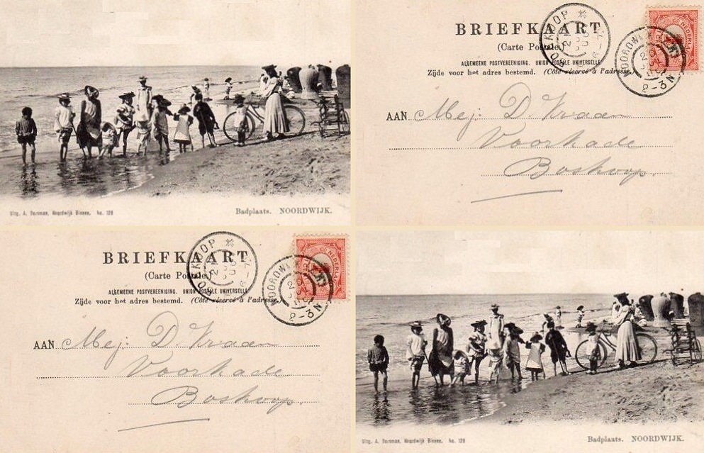 Op 20 juli 1900 ging het pootje baden nog met lange jurken aan en bij voorkeur nam je ook nog eens je fiets mee op het strand. Dat laatste zorgt overigens wel voor een idyllisch beeld: het meisje met mooie kleren aan. Het hoofd in de schaduw van haar hoedje. En de fiets.