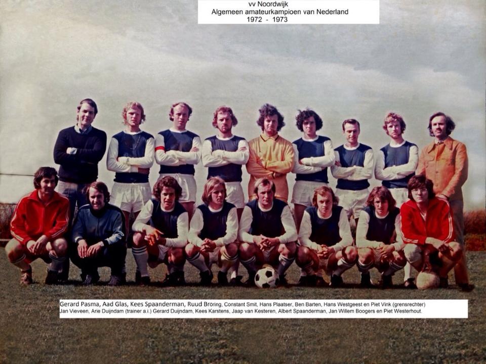 In de scheidsrechterij had hij een goed voorbeeld: zijn vader Piet, rechtsstaande opd e foto, was de grensrechter van het eerste elftal van de v.v. Noordwijk, dat in de zomer van 1973 algeheel landskampioen zou worden bij de Nederlandse amateurs.