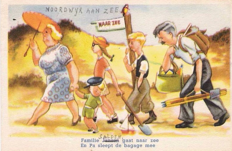 Als deze kaart de onderlinge verhoudingen typeert binnen de familie Salden, komt Vader Salden er niet best van af. Als ik hem was geweest had ik het ijsje van zijn oudste zoon in diens haren gesmeerd en Moeder Salden met tenminste één tas opgezadeld. Met dit soort vermeende humor kom je vandaag de dag niet meer weg. Meest lachwekkend zijn natuurlijk de hoge hakken, waarmee Moeder Salden door het zand loop te banjeren.