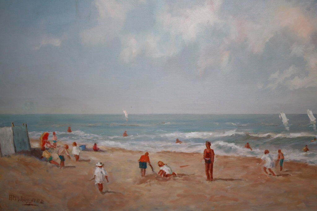 Eerder hadden we al twee andere schilderijen van A.M. Woudstra te pakken met Noordwijkse taferelelelen erop. Deze kende ik nog niet: “Kinderen op het Strand van Noordwijk”. Woudstra zelf ken ik ook (nog steeds) niet. In de bekende handboeken en naslagwerken is zijn of haar naam niet terug te vinden. Misschien dat het om een lokale kunstenaar/es ging? In Noordwijk kan ik één ‘A. Woudstra’ traceren: ene Albert Woudstra die in 1935 op 22-jarige leeftijd trouwde met ene Geertruida De Bes. Volgens dezelfde bron (de voortreffelijke Montanus) was Albert echter monteur, maar goed: dat laat onverlet dattie in zijn vrije tijd mooie schilderwerken maakte.