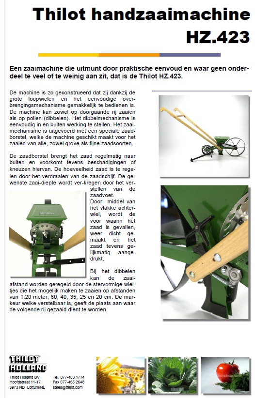 Dat was in 1919, maar nu – 95 jaar later – wordt diezelfde handzaaimachine nog steeds verkocht door dezelfde firma. Thielen heet tegenwoordig Tilot en de ‘Ideaal’ is omgedoopt in de HZ.423. Maar verder zou Groentendrogerij De Groot hier nog altijd terecht kunnen voor een nieuwe handzaaimachine of voor onderdelen daarvan. ‘Zou kunnen’, maar Groentendrogerij De groot is er niet meer.