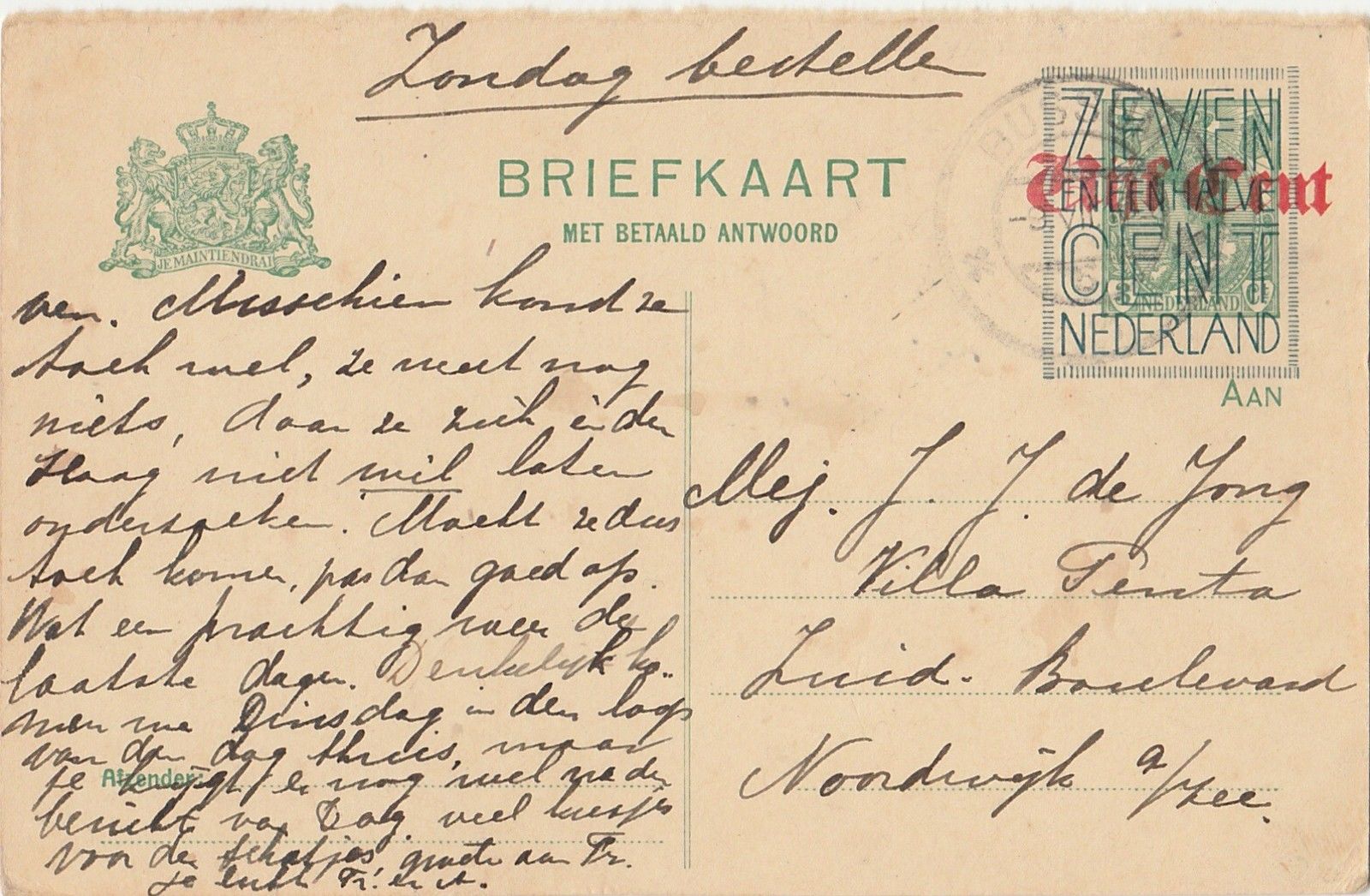 Een andere prangende vraag die deze kaart oproept kan ik wel beantwoorden: al die stempels en overdrukken op de zegel stammen van ergens uit de Jaren Twintig van de Vorige eeuw. Er waren blijkbaar zoveel kaarten gedrukt, dat het niet loonde om bij iedere tariefwijziging maar weer nieuwe kaarten te maken. Entariefwijzigingen waren er nogal, in die dagen. Dat had te maken met tariefsverlagingen die werden doorgevoerd, maar dan moest als gevolg van de gierende inflatie zo’n verlaagd tarief toch weer worden opgehoogd. Dat leverde de ene overdruk na de andere op. En dan moest in dit geval de kaart ook nog op zondag worden besteld. Dat kon, maar dat kostte dan ook weer extra. Tsja. En dan was dit ook nog eens een ‘briefkaart met betaald antwoord’, dwz men stuurde een kaart met daaraan een – voorgefrankeerde – kaart, waarop de ontvanger dan weer zijn of haar antwoord kon schrijven. Tsjatsja.