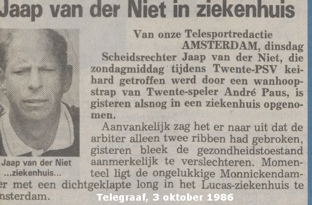 Ik was altijd erg onder de indruk van Jaap van der Niet als doelman van Noordwijk. Lange, atletische vent, meestal een gele trui over een witte broek. Pracht keeper. Jaap bracht het na zijn actieve voetbalcarrière – inmiddels verhuisd naar Monnickendam – tot scheidsrechter in het betaald voetbal. Van 1983 tot 1990 floot hij in de Eredivisie. Tijdens de door hem geleide wedstrijd FC Twente-PSV (0-0) werd hij geveld door een oerend hard schot van Twentespeler André Paus en moest hij – helemaal van de wereld – vervangen worden.