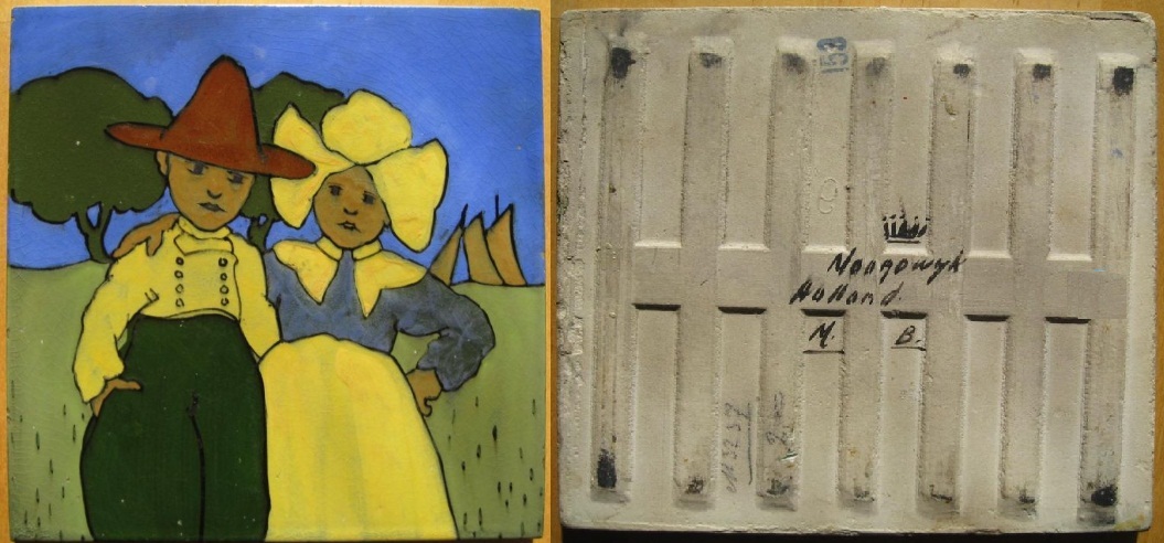 Zeer zeldzame streekdrachttegel gemaakt bij de Porceleinfabriek De Kroon te Noordwijk. Voorstelling is een ontwerp van Henri Breetvelt. Te koop aangeboden op marktplaats.nl