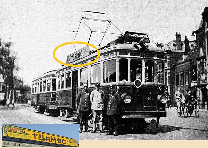 Op de tram staat een reclame van Turmac: de Turkish Macedonian Tobacco Company, een tabaksfabriek die tussen 1920 en 1960 in Zevenaar actief was. Over Turmac is meer bekend via een lemma in de grootse Wikipedia encyclopedie. Ik citeer: