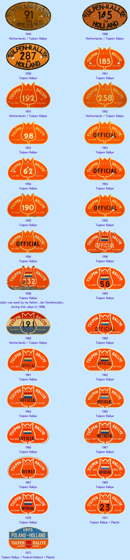 En nu we toch met de Tulpenrally bezig zijn: dit zijn de officiële badges en platen van een reeks van Tulpenrally’s, gereden tussen 1950 en 1978. Ze komen uit de collectie van Jhr. W.J. Teding-Van Berkhout. Teding-Van Berkhout was een gepassioneerd rallyrijder in de Jaren Vijftig van de vorige eeuw. De collectie maakt intussen deel uit van een nog grotere verzameling van kentekenplaten, die ik aantrof op internet: Plate-Planet. Een werkelijk verbluffende collectie van Nederlandse en internationale kentekenplaten, rallyplaten, bromfietsplaatjes, etc. Een site, waarop je eindeloos kunt blijven hangen en genieten.