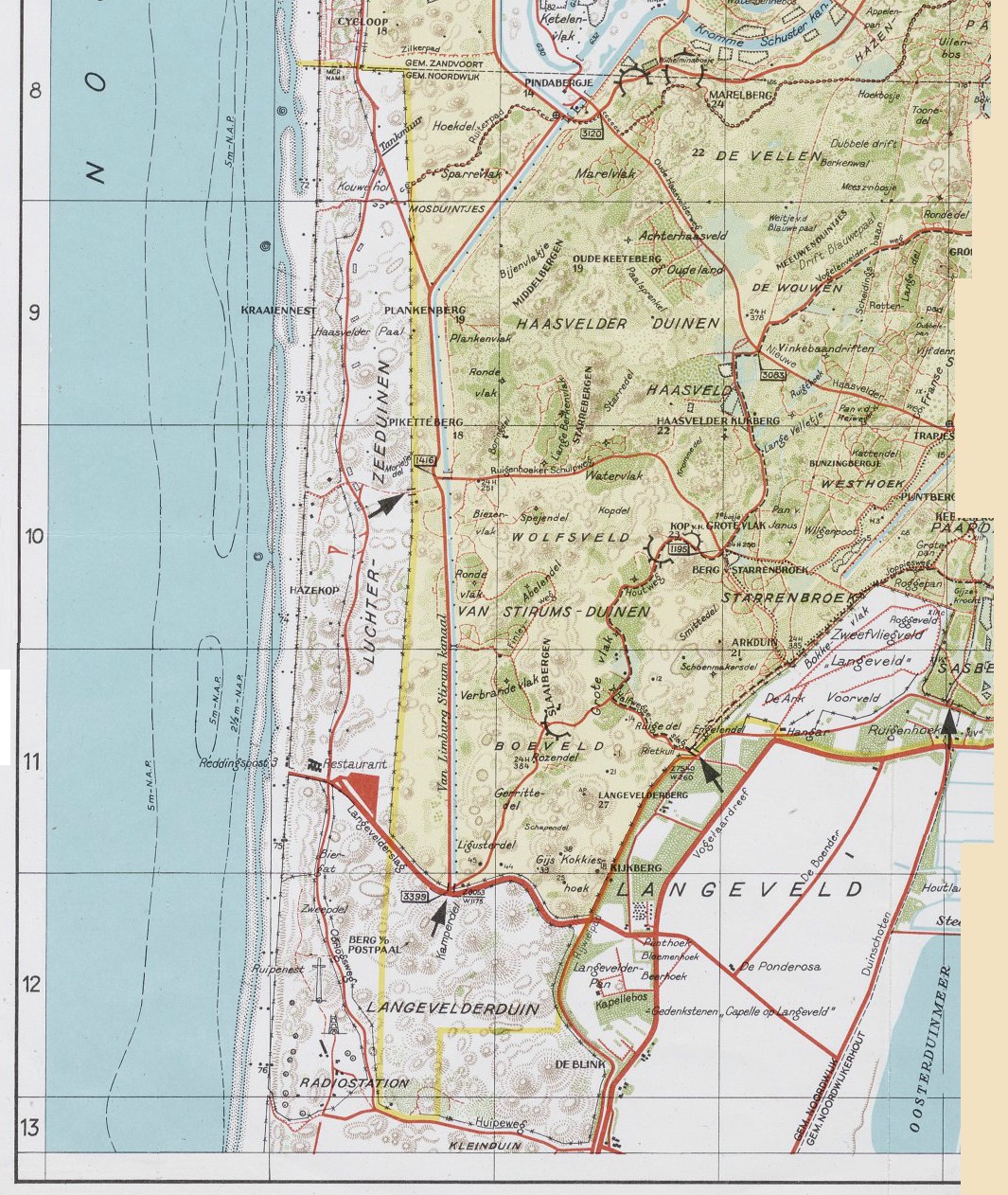 De kaart is een uitsnede uit een grotere kaart van de hand van cartograaf F.P. van der Berg en hij is opgenomen in de Kaartencollectie van de Provinciale Atlas Noord-Holland. Hij dateert van 1981. En wat mij er in het bijzonder in opvalt is het kleurrijke scala aan namen van plekken in – voornamelijk – het Langeveld en hoger: Gerrittedel, Gijs Kokkieshoek, Ruige Del, Sparrevlak, Marelvlak, Mosduintjes, Pan van Janus, Van Stirums Duinen, Ruipenest, Hazekop en eindelijk………. Luchter Zeeduinen, een naam waarvan ik wel had gehoord, maar waarvan ik niet wist waar of dat dan die duinen lagen.