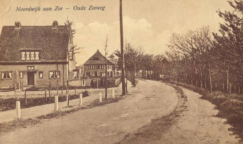 Wat toch ook vroeger al een belangrijke verbinding moet zijn geweest van Noordwijk-Binnen naar Noordwijk-Zee – de Oude Zeeweg – is op deze foto een arremoeiig karrenspoor, waar je je frêle koets of automobiel niet graag overheen zou sturen. Slordig plaveisel met onvermoede kuilen, uit het lood staande paaltjes en in de zomer veel stof en zand. Als dat een waardig toegang tot een zichzelf respecterende badplaats mocht heten, dan weet ik niet meer waar dat zelfrespect precies te vinden is. Erg landelijk was het allemaal wel.