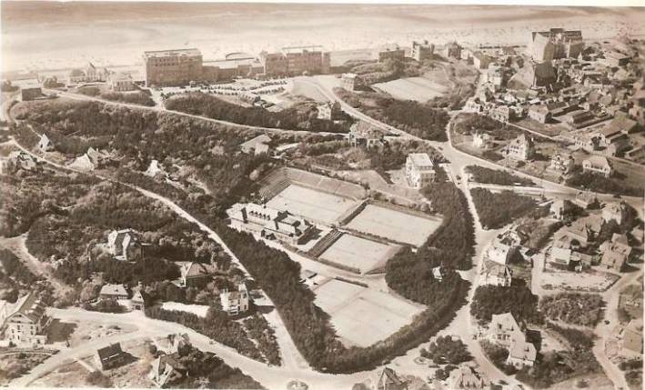 Een bijna adembenemende luchtfoto van het Casino-tenniscomplex. Nog van vóór de Tweede Wereldoorlog, want ik zie in de gauwigheid de Villa Vera nog in al haar schoonheid stevig verankerd op het duin staan. Om maar wat de noemen. En verder is aan het einde van de Oude Zeeweg, c.q. De Grent nog geen enkele sprake van de gatenkaas, met de aanleg waarvan men pas na de oorlogzou beginnen. En er stonden nog dennen, véél dennen. Die misselijke dennenscheerder was nog niet in Noordwijk gearriveerd.