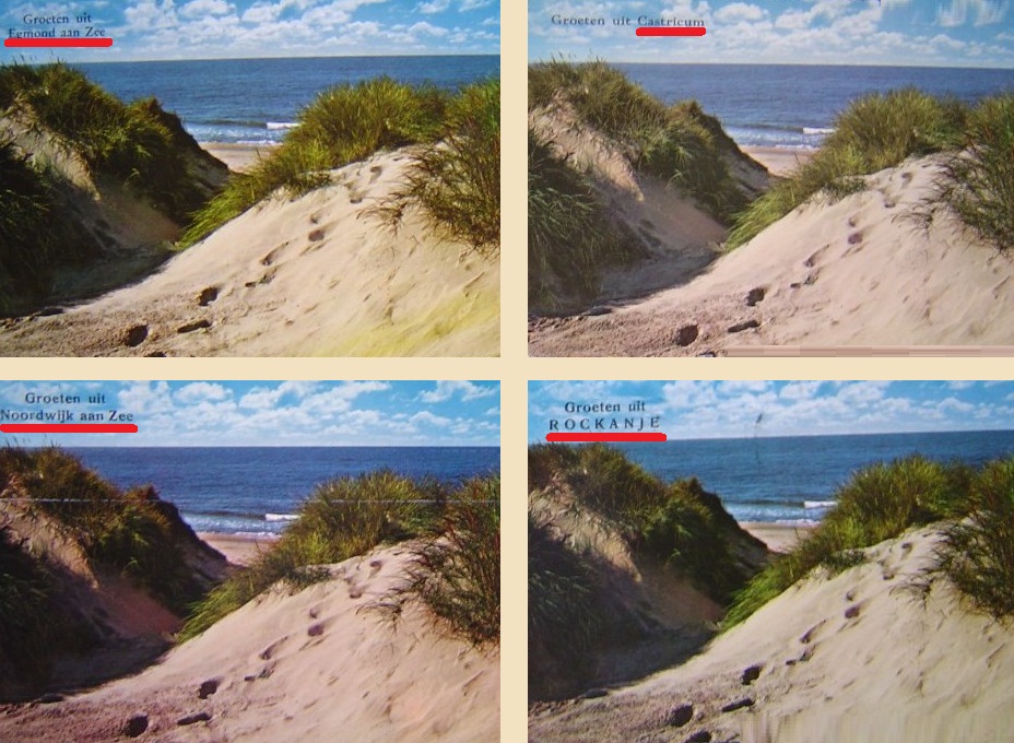 Op delcampe.net is iemand zo vriendelijk geweest om datgene te laten zien, wat ik hier al eens eerder – en met veel andere foto’s – heb aangetoond: dat die hele ansichtkaartenuitgeverijbusiness soms danig aan het frauderen is. Dat men boven één en dezelfde foto steeds weer de groeten uit een andere plaats laat komen. Kaarten die – in dit geval – in vrijwel allekustplaatsen te koop zullen zijn geweest.
