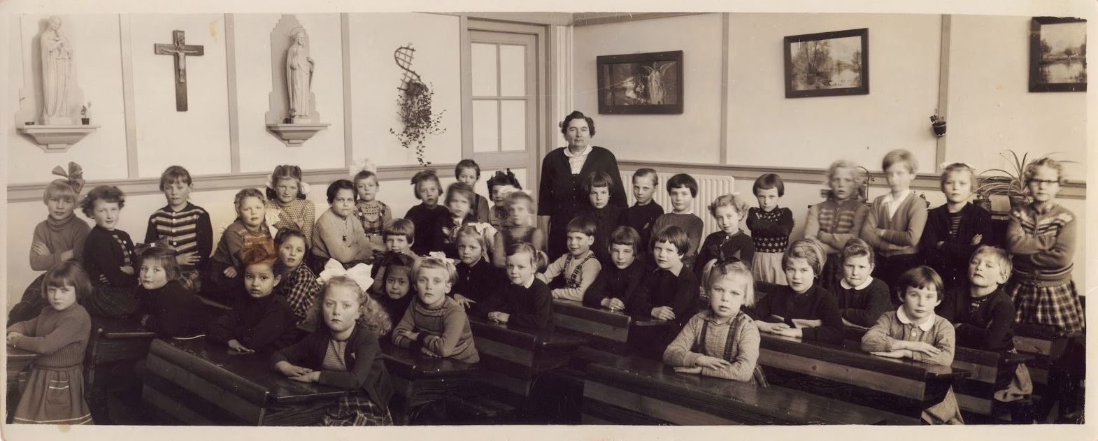 Ik vind deze foto op internet en in hetbijschrift wordt vermeld dat het hier ging om de eerste klas van de RK Meisjesschool in Noordwijk Binnen in 1956. De juf herken ik wel als Juffrouw Van der Schalk, maar van de meiden herken ik er geen. Ik was dan ook van latere datum en zat op de RK Jongensschool in Noordwijk Binnen, wat fundamenteel een ander type school was.