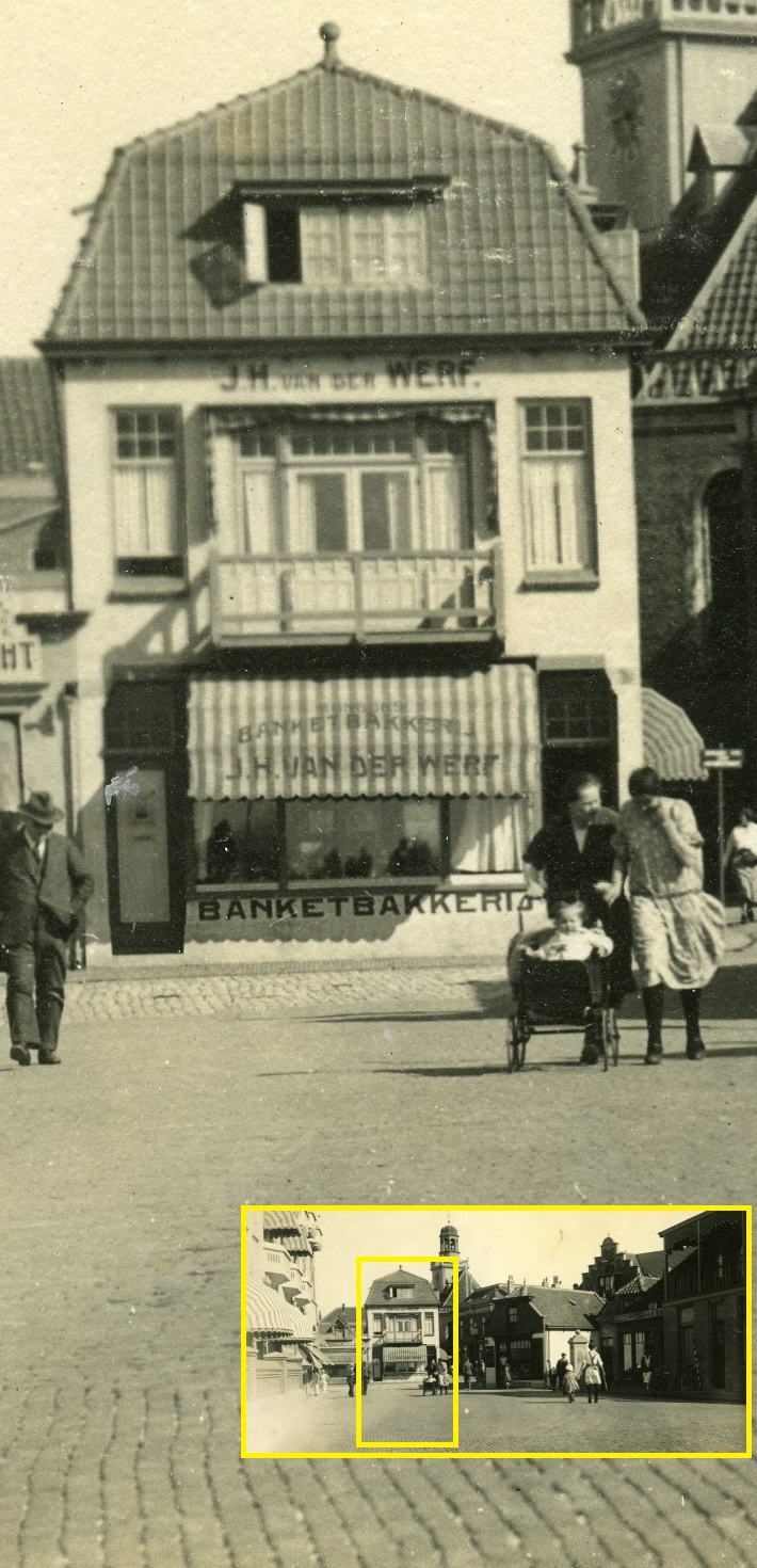 Nog een uitsnede uit dezelfde foto als de vorige. Nu met het pand van banketbakker J.H. van der Werf erop, ook al zo’n imperialist uit Noordwijk-Binnen. De weinigen die zich hier richting de boulevard begeven, moeten optornen tegen een flinke storm. Alleen het kind in de kinderwagen zit er unverfroren bij, niet gehinderd door enigerlei bries of aanverwante storm.