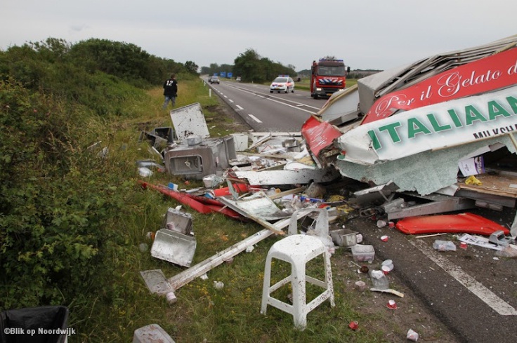 In juni 2012 kwam een ijscoman bij Noordwijk in een verkeersgevaarlijke situatie terecht en raakte zijn ijsmobiel total loss. Naar verluidt was hij op weg naar huis na een dag werken op de Noordboulevard in Noordwijk. Bij het ongeluk zou hij overigens nauwelijks een schrammetje hebben opgelopen. Tussen de scherven door kan ik mij voorstellen dat het een mooie ijskar moet zijn geweest. Van een heel andere orde dan de houten ijskarren, die tot nu toe voorbij zijn gekomen.