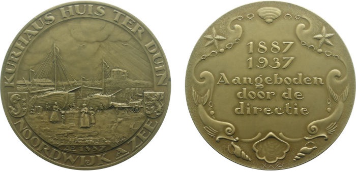 De penning betreft het 50-jarig bestaan van Huis ter Duin in 1937 en laat een gezicht zien op het strand met vissersboten en daarachter op het duin het eerste gebouw van Huis ter Duin zelve. Een bronzen penning, vervaardigd door Johannes Cornelis Wienecke (1872-1945), beeldhouwer en ‘medailleur’. Wienecke is vooral bekend als ontwerper van reguliere Nederlandse geldmunten.