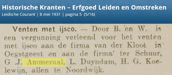 Gerardus Jacobus (Gerrit) Ammeraal – in de Noordwijkse volksmond ‘Gerrit Botje’ (1893-1968) – kwamen we eerder tegen als ijsverkoper op de Noordboulevard. Op de genealogie-site van Hans Montanus staat hij te boek als winkelier, koffiehuishouder en ijscoman. Gerrit Ammeraal zou ook eigenaar en oprichter zijn geweest van de Eerste Noordwijksche IJsfabriek, maar in die hoedanigheid kan ik hem nergens terugvinden. Volgens de krantenleggers van het Regionaal Archief Leiden en Omstreken had Gerrit aanvankelijk een handel in boter, kaas en eieren, maar die handel ging begin Jaren dertig failliet.