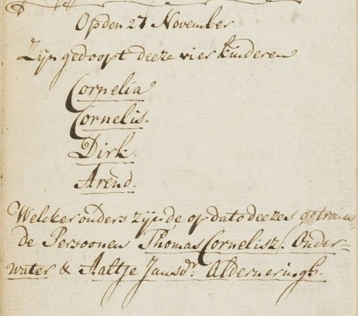 Dit kind was ruim 3 weeken voor den doop in onecht en overspel uit boven gemelde ouders geboren, zijnde de vader Thomas Kornelis Onderwater een weduwnaar, en de moeder Aalt Jansdr Alderneering, die gehuwd was met eene soldaat, genoemt Jan van Leeuwen geboren van Leiderdorp, wist niet of deze haar echte man dien zij in meerder dan 2 jaren niet gezien hadde uit den dienst gedeserteerd, in den krijg gesneuvelt of zijnen natuurlijke doot gestorven, dan of hij in Frankrijk krijgsgevangen ware, noch waar hij in de werelt was, zodat zij hier van onkundig zijnde, met meergemelde Thomas Kornelisz Onderwater overspel bedreven, en dit kind hem gebaart hebbe, derwijl nu beide de ouderen van dit kind uit ouderen en voorouderen, die den Hervormden Godsdienst waren toe gedaan geweest geboren en zelven beiden in den Hervormden Christelijke kerke in hunne kintsheid door den Doop waren in gelijft geweest.