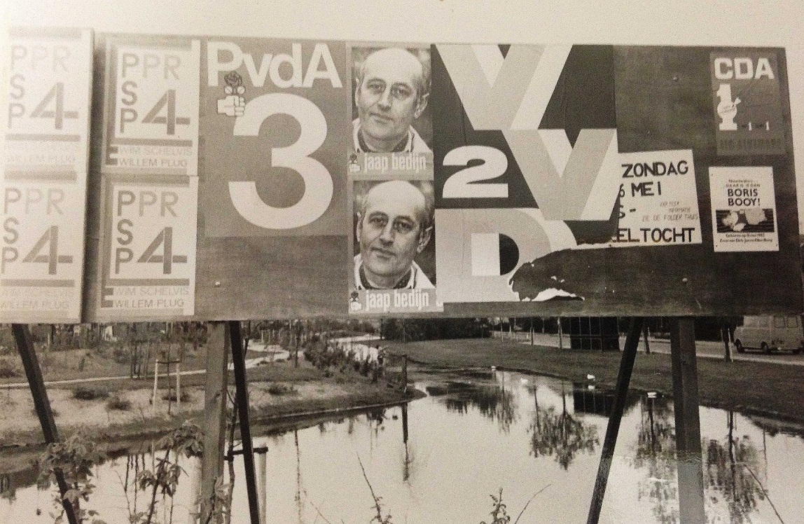 Een verkiezingsbord van ergens uit de Jaren Zeventig, vermoed ik. Klassieke indeling van politieke partijen: CDA, VVD, PVDA en een gezamenlijke lijst van PSP en PPR. Niks geen lokaal gedoe en geneuzel, behalve Boris Booy misschien.