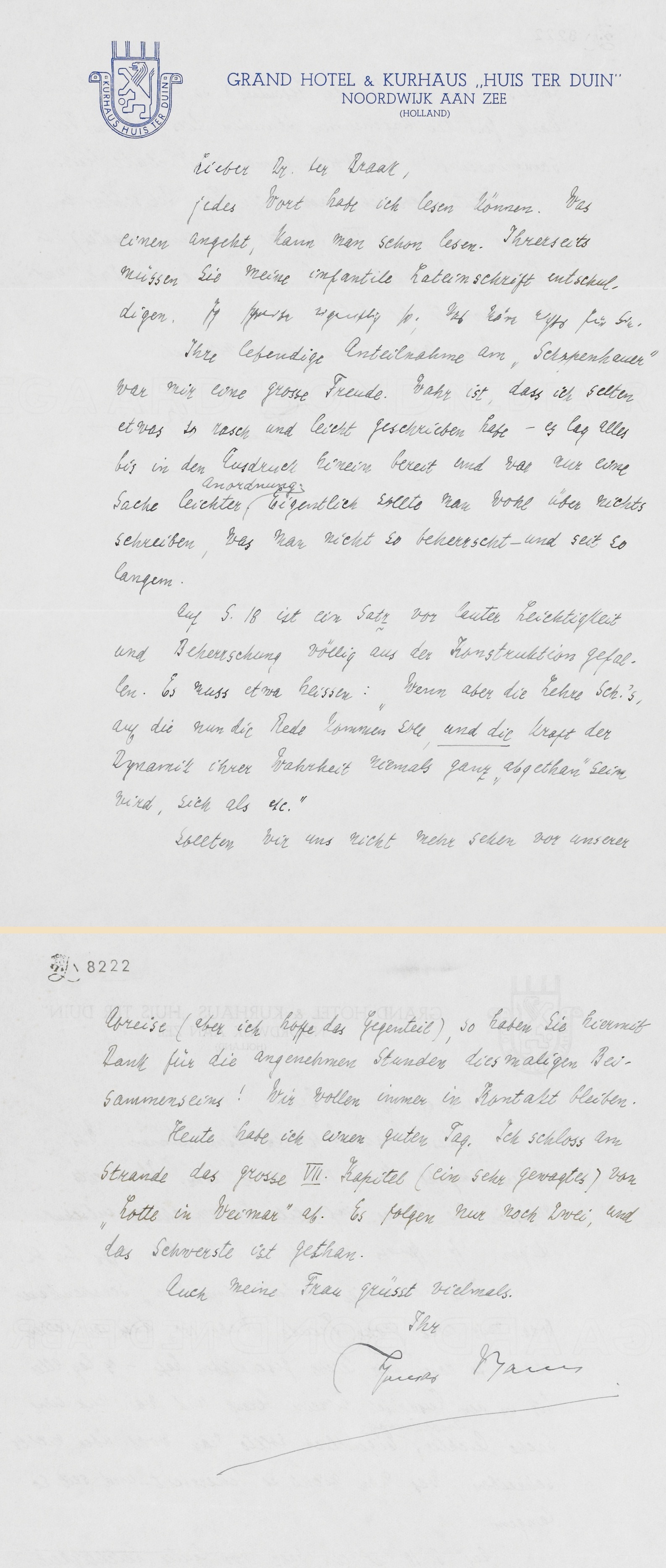 Sollten wir uns nicht mehr sehen vor unserer Abreise (aber ich hoffe das Gegenteil), so haben Sie hiermit Dank für die angenehmen Stunden diesmaligen Beisammenseins! Wir wollen immer in Kontakt bleiben. Heute habe ich einen guten Tag. Ich schloss am Strande das grosse VII Kapitel (ein sehr gewagtes) von ‘Lotte in Weimar’ ab. Es folgen nur noch zwei, und das Schwerste ist getan. Auch meine Frau grüsst vielmals, Ihr Thomas Mann