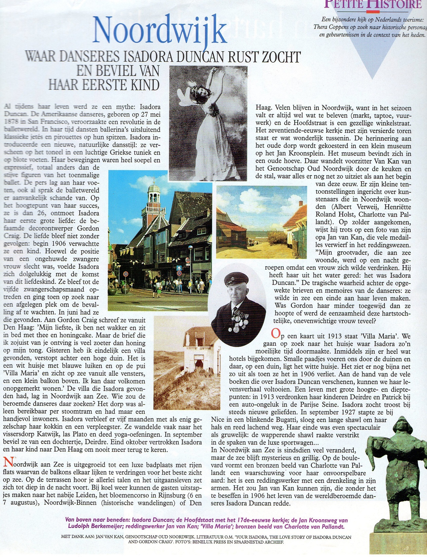 Ik geloof in een ander verhaal, verteld door Lady Kathleen Scott (de vrouw van de helaas te vroeg overleden Zuidpool-reiziger Captain Scott). Zij was bevriend met Duncan en verbleef die nacht bij haar. Ze werd naar eigen zeggen (lees haar memoires) wakker van een openstaande deur, zag dat Duncan de hort op was en trok intuïtief richting strand. Daar zag ze Duncan en ze wist haar te overreden terug te gaan en gewoon weer te gaan slapen. Aldus geschiedde. Daar kwam geen Jan van Kan aan te pas, hoezeer Van Kan in talloos veel andere situaties altijd wél de Redder-in-Nood was geweest.