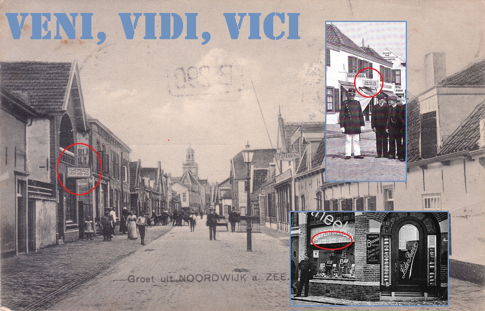 Het blijft een rare naam voor een sigarenmagazijn: “Veni, vidi, vici”- “Ik kwam, zag en overwon”, maar daar zal wel een verhaal achter zitten. Interessanter is dat dit sigarenmagazijn door de jaren heen een hele odyssee door Noordwijk aan Zee heeft gemaakt. Ik heb deze tabaksnering eerder al eens gelokaliseerd aan de ene én aan de andere kant van het Calisplein, later Palaceplein. Respectievelijk achter Hotel Van Konijnenburg en in de latere winkel van Jan van Kan.