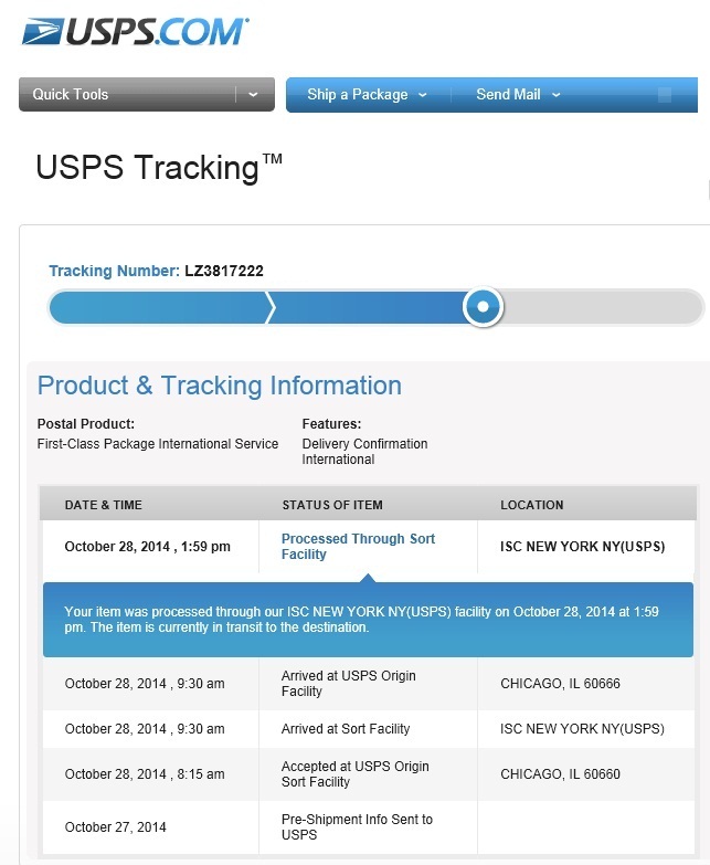 Die mededelingen van USPS kun je tevoorschijn toveren aan de hand van een zgn. ‘trackingnummer’ dat je krijgt. Aan de hand daarvan kun je iedere ‘move’ van het betreffende poststuk volgen. Ik besef dat het eigenlijk heel aardig zou zijn, als je aan de hand van een ‘trackingnummer’ ook zou kunnen nagaan – teruggaand in de tijd – waar de brochure zich zo door alle tijden heen bevonden heeft: hoe die daar in Chicago terechtgekomen is, vanuit Noordwijk, welke locaties daar nog allemaal tussen hebben gezeten, etc.
