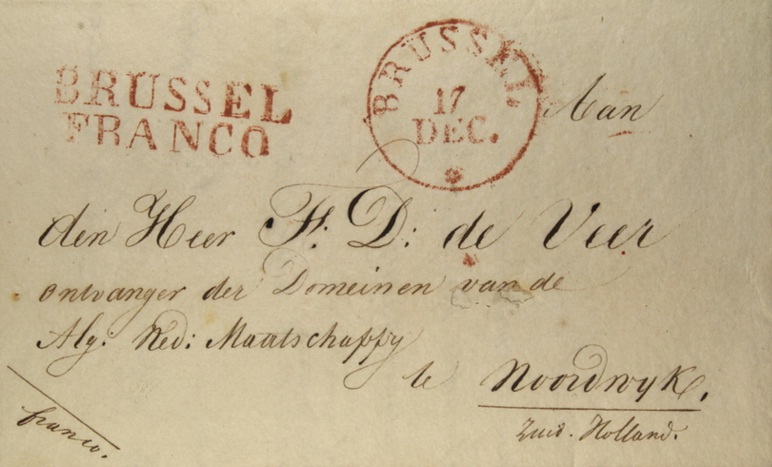 Een brief van 17 december 1829 (185 jaar geleden). Franciscus Daniel de Veer was de zoon van Joseph de Veer, directeur van een vooraanstaand onderwijsinstituut in Noordwijk. Franciscus (wij mogen ‘Frans zeggen) was inderdaad ontvanger te Noordwijk. Hij leefde van 1774 tot 1842. Hij kreeg wel vaker een brief uit Brussel (zie eerder blog), maar dat was niet zo gek: Noordwijk én Brussel behoorden beiden tot de Nederlanden van die tijd. En in Brussel zetelde de Algemene Nederlandsche Maatschappij (na de onafhankelijkheid van België: De Generale), een industriebank die door Koning Willem I in 1822 was opgericht. Die bank beheerde ook domeinen en Frans was de aangewezen man om de pacht van de domeinen in Noordwijk te innen en aan Brussel over te maken. Zoiets zal het wel geweest zijn.