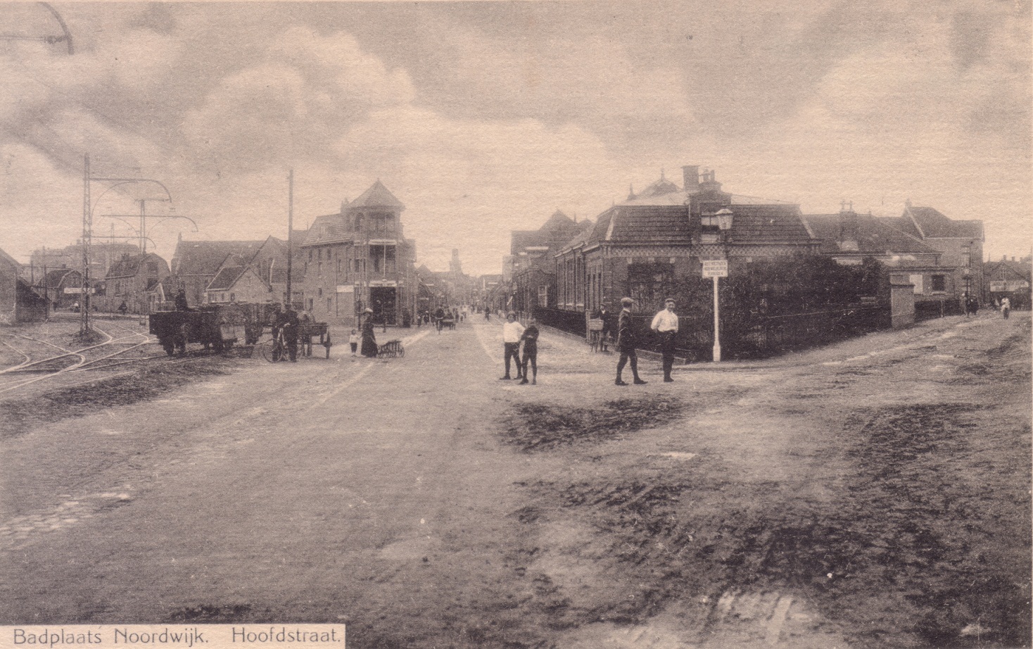 Een prachtige foto van het kruispunt Schoolstraat, Hoofdstraat, Huis ter Duinstraat (ook al heetten die straten toen allemaal nog niet zo). Twee keer klikken en je zit er weer middenin. Interessant is het spoor van de stoomtram dat al richting het – dan pas gebouwde – Huis ter Duin gaat. Maar vooral: dat er een zijspoor juist hier afbuigt richting de Hoofdstraat. Een keerspoor? Ik kan niet bedenken waartoe dat nu diende.