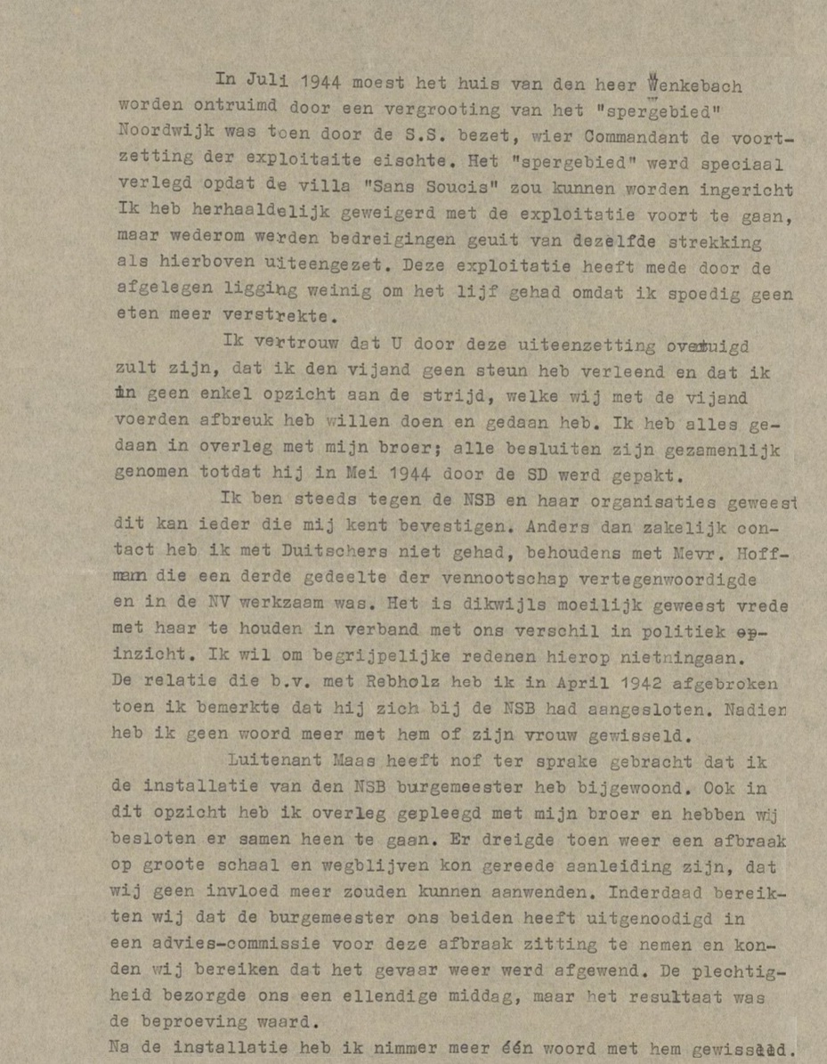 Het was alles bij elkaar een wat tragische situatie, want Wolfgang stond er eigenlijk helemaal alleen voor. Hatto zat in de VS en andere broer Rudolph was door de Duitsers gevankelijk weggevoerd en omgekomen in het concentratiekamp Neuengamme vanwege door hem gepleegde verzetsdaden. Wolfgang en Rudolp hadden samen de exploitatie gedaan van het hotel, maar moesten met hun nering later uitwijken naar de Villa “Sans Souci” aan de Prins Hendrikweg, omdat Huis ter Duin midden in het spergebied was komen te liggen. Als notabelen hadden ze ook – min of meer gedwongen – acte de presence gegeven bij de installatie van NSB-burgemeester Gerhard Musegaas en dan hadden ze blijkbaar ook nog contact gehad met de roofbankier Alexander Rebholz, die wél opzichtig geheuld had met de Duitsers (hij werd later weliswaar veroordeeld, maar uiteindelijk werd-ie met zijn niet eens ontnomen Nederlands paspoort gewoon de grens over gezet).