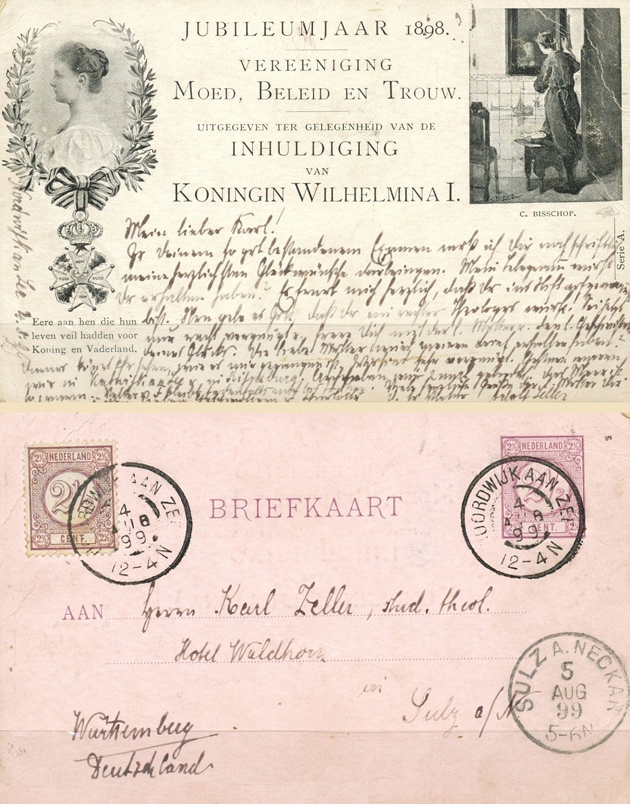 Maar daar gaat het nu niet om: hier valt weer eens op hoe snel de posterijen van die dagen werkten: de kaart werd in Noordwijk afgestempeld op 4 augustus 1899 en moest zo’n 700 kilometer verder naar het stadje Sulz aan de Neckar in Württemberg (later Baden-Württemberg). Niet naast de deur. Maar toch slaagde men erin de kaart al een dag later op het postkantoor in Sulz te laten belanden, want daar werd-ie afgestempeld op 5 augustus 1899.