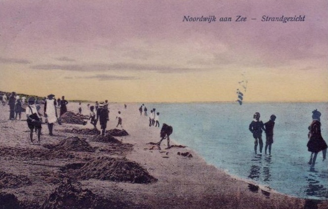 Wie weet wat er met deze kaart gebeurd is, mag het zeggen: degene die met het inkleuren van de zee begonnen is, is er op een gegeven moment simpelweg mee opgehouden. Geen inkt meer? RSI? Geen zin? Het is de slordigstesteste ansichtkaart die ik van Noordwijk ben tegengekomen.