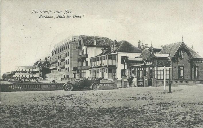 Dit plaatje biedt een prachtige aanblik van zo’n prachtige auto, met op de achtergrond Huis ter Duin in de Jaren Tien en een echtpaar in zomerzondagsgoed.