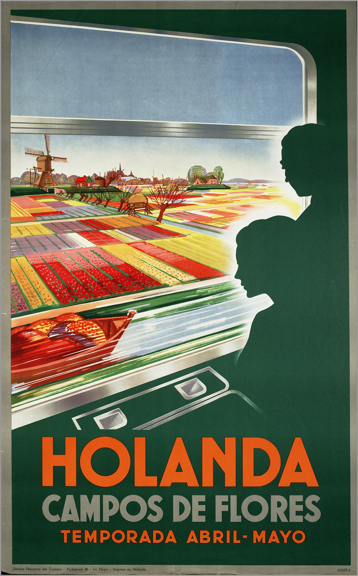 Volgens deze Spaanstalige propaganda kon je de bollenvelden ook vanuit de trein bezichtigen, althans die suggestie werd met deze plaat wel gewekt. Dat kan overigens nog steeds, ofschoon de treinen tegenwoordig misschien wel harder gaan (te hard?). Maar zelfs dan. Zelfs dan kun je vanuit de trein achter de bollenvelden ook nog Huis ter Duin in Noordwijk aan Zee ontwaren. Én de twee torens van Noordwijk-Binnen. Yes, you can.