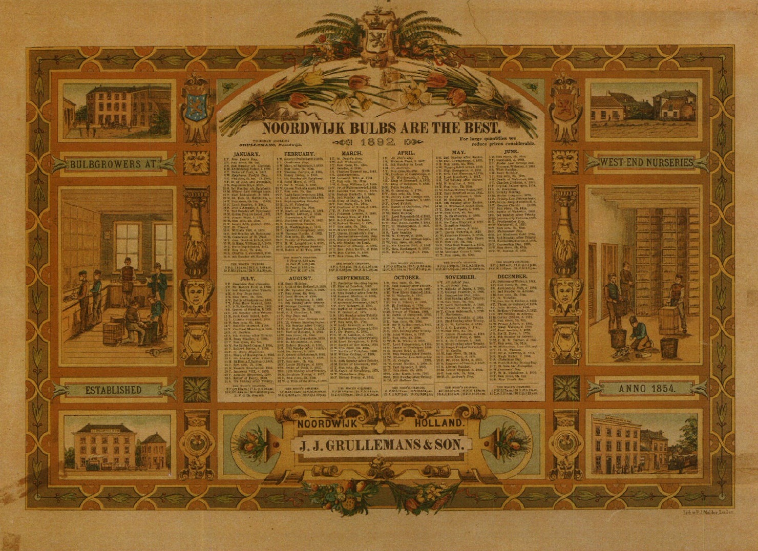 Een kort verhaal over de grote Noordwijkse bloembollenfirma J.J. Grullemans & Zonen stond hier nog niet zo lang geleden. Nu tref ik een wervende reclamekalender uit 1892 aan van diezelfde firma. Mooi vormgegeven, maar vooral ook wervend: “Noordwijk Bulbs Are The Best!”