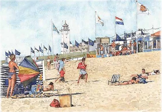 De kunstenaar Albert-Jan Cool is hier wel vaker voorbij gekomen met prachtige prenten van het Noordwijkse strand en andere Noordwijkse beelden. Dit is er weer eentje, overigens ook als ansichtkaart te koop. Zie de website van Coolart.