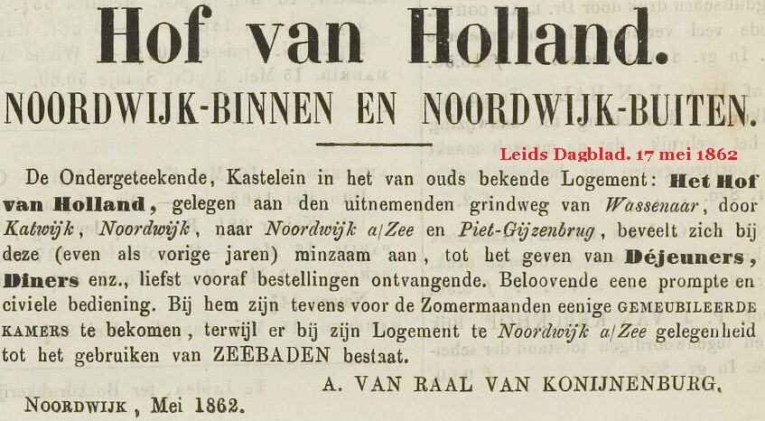 Antonie van Raal van Konijnenburg bezit de nodige faam in Noordwijk, als de stamvader van het (eerste?) pension aan Zee. Minder bekend is dat hij en zijn familie al gedurende tientallen jaren uitbater waren van het Hof van Holland in Noordwijk-Binnen. Deze advertentie maakt van die band tussen beide etablissementen genoegzaam gewag.