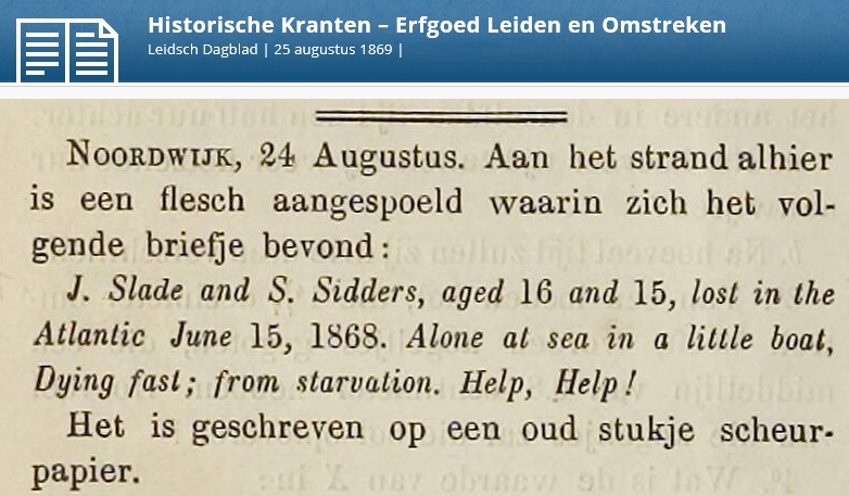 Ik stuit op dit krantenbericht en probeer me voor te stellen welk enorm drama zich hier moet hebben afgespeeld. Twee jonge jongens, Slade en Sidders, schipbreukelingen in de Atlantische Oceaan, bijna stervend van de honger. 15 Juni 1868. Het briefje dat ze in een fles verstoppen, wordt pas meer dan een jaar later gevonden en dan ook nog helemaal in Noordwijk.
